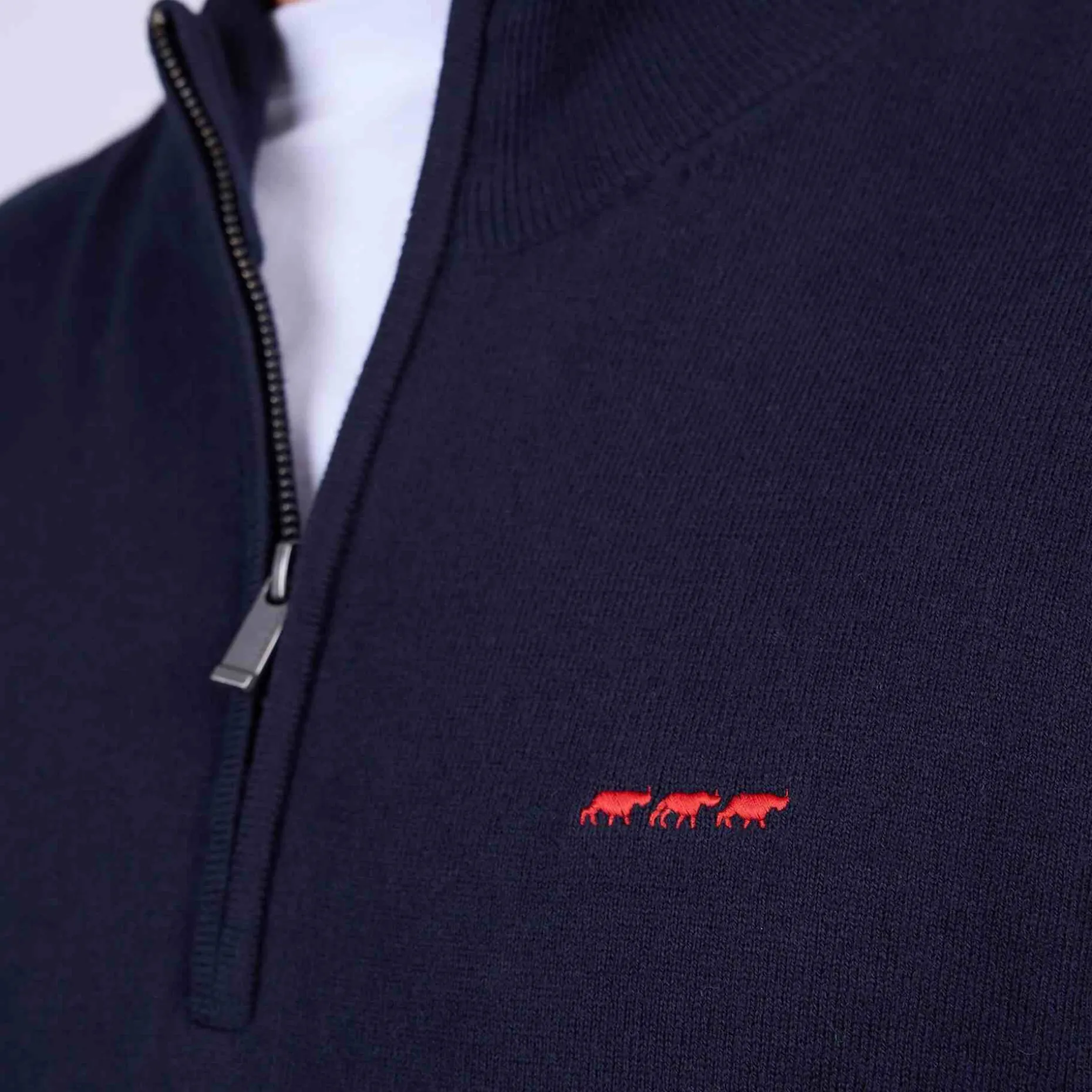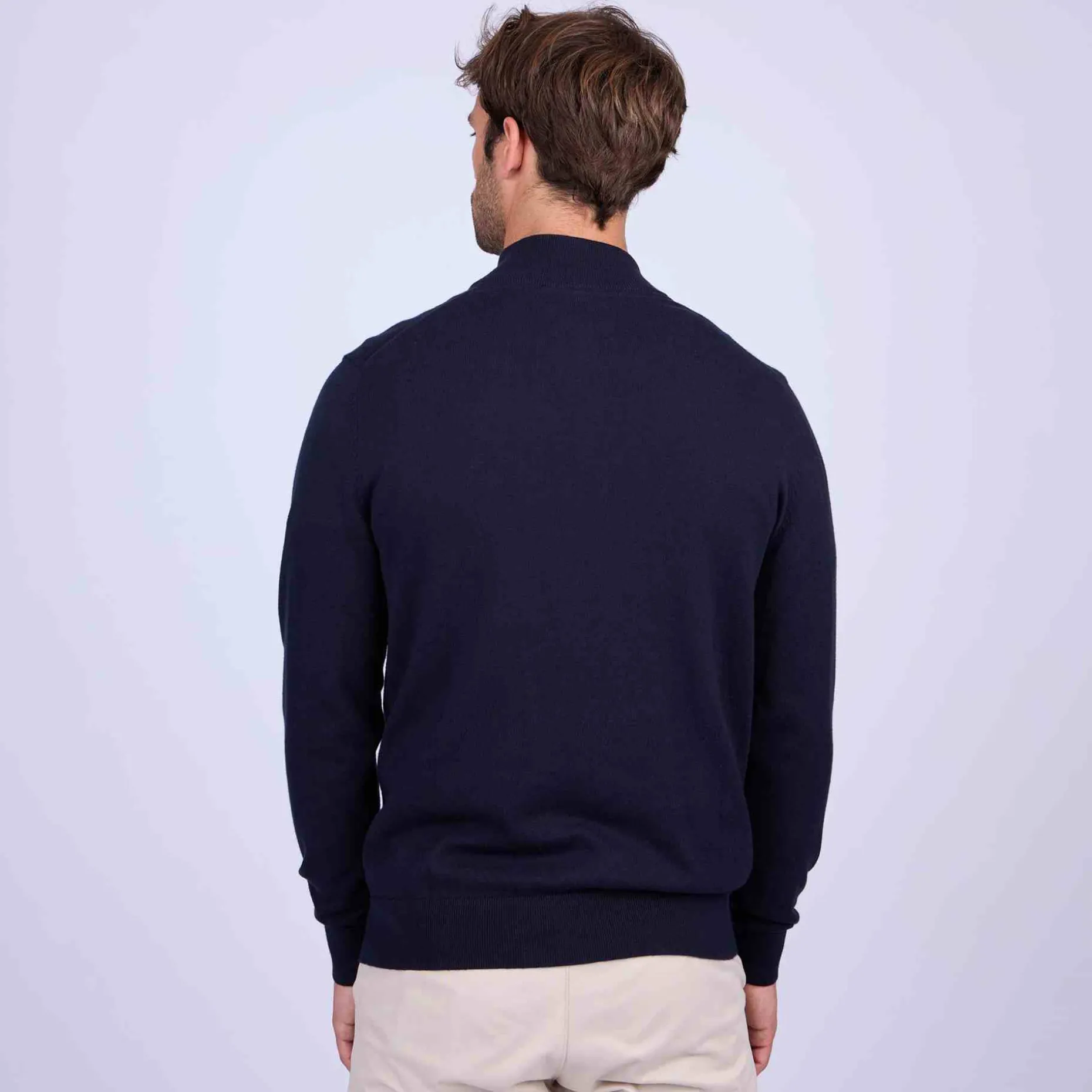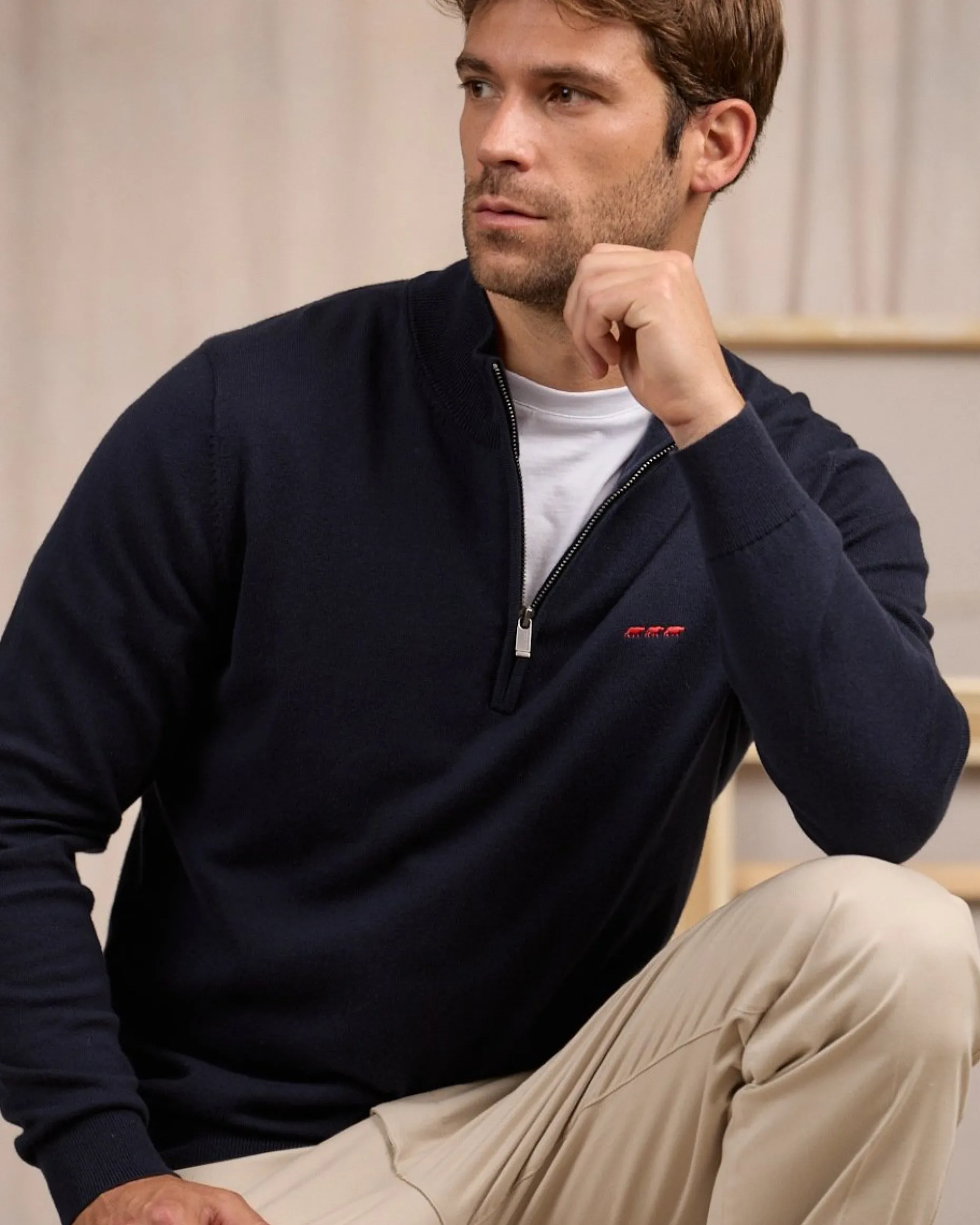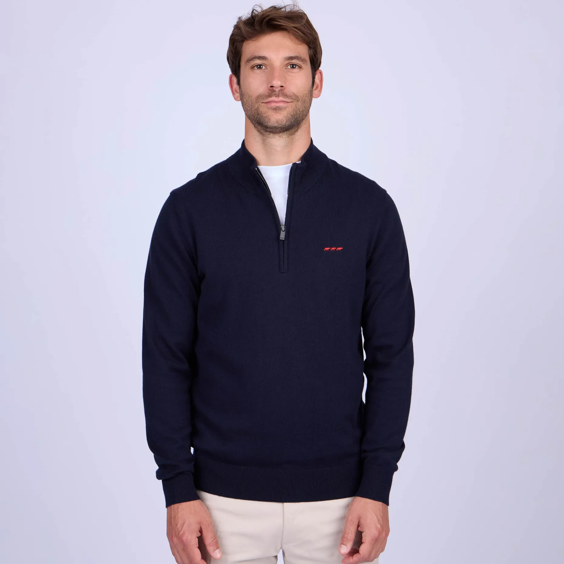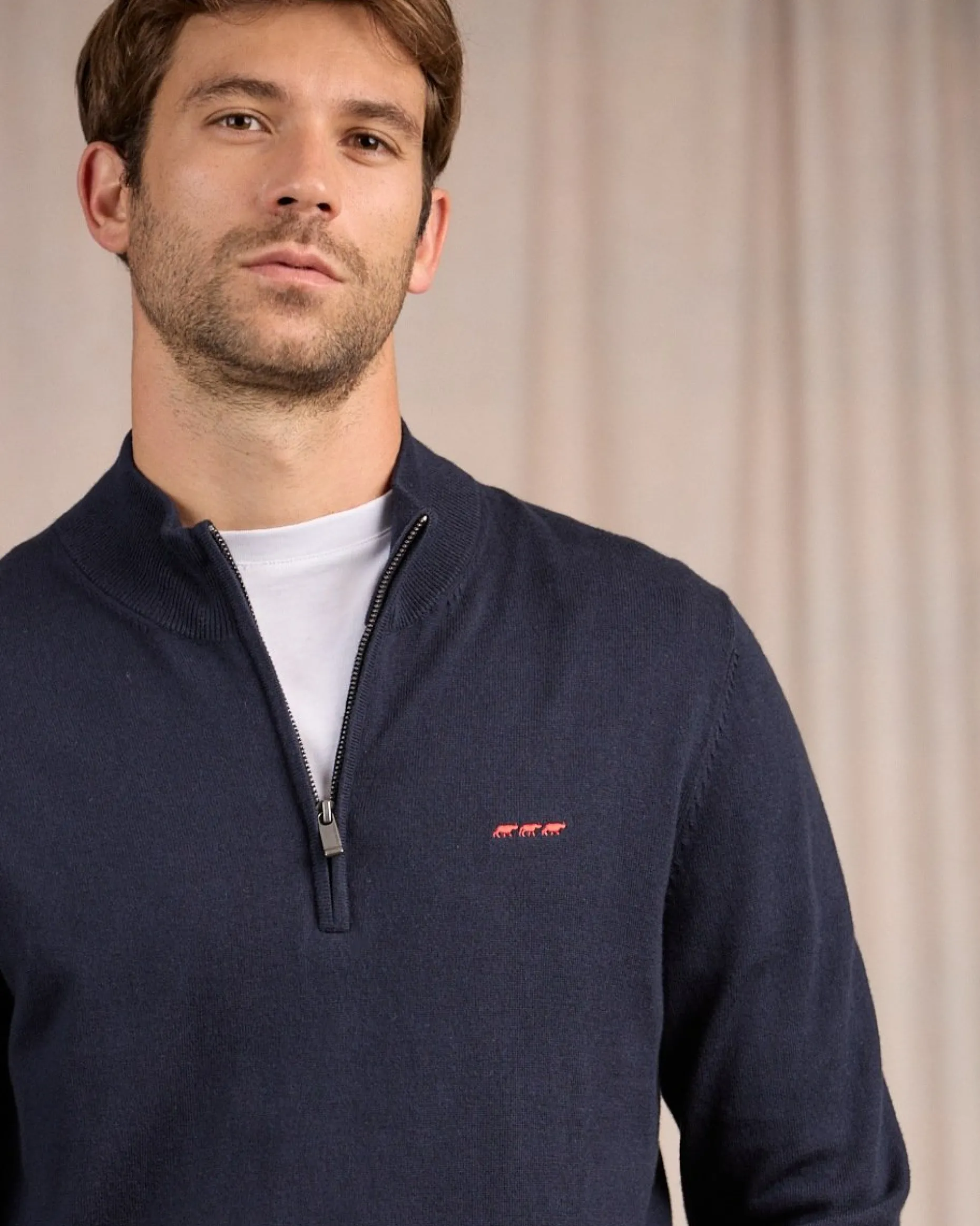 À la fois chic et sobre, ce pull à manches longues est un indémodable ! Décliné dans un coloris bleu marine, ce modèle tendance se porte aussi bien avec un jean qu’un pantalon chino. Il possède une coupe droite et un col avec fermeture éclair pour des tenues confortables, mais toujours soignées. Confectionné en coton avec une pointe de cachemire, il offre une sensation de confort agréable sur la peau. Des finitions en bord-côtes et un logo 3 vaches brodé sur la poitrine apportent la touche finale.