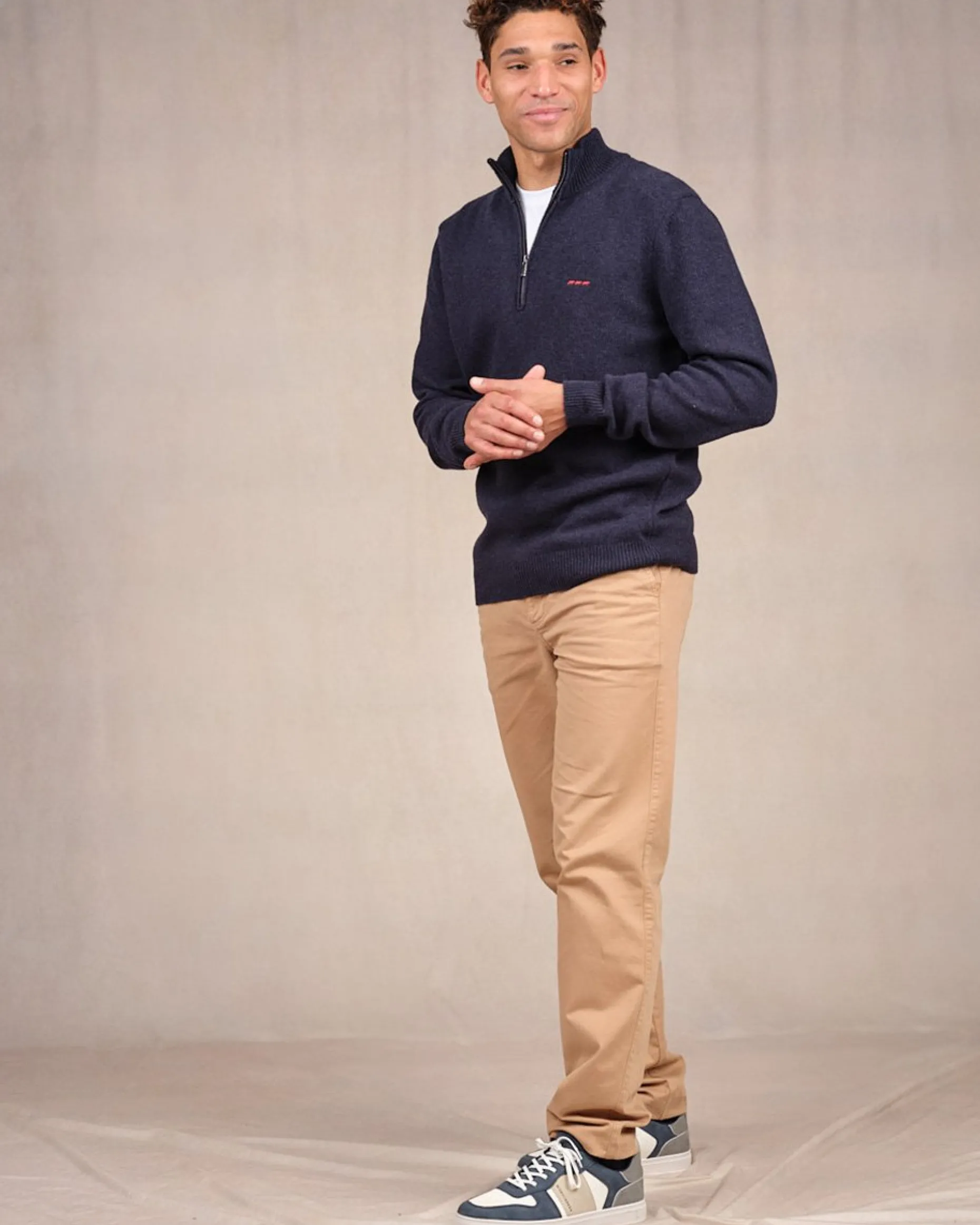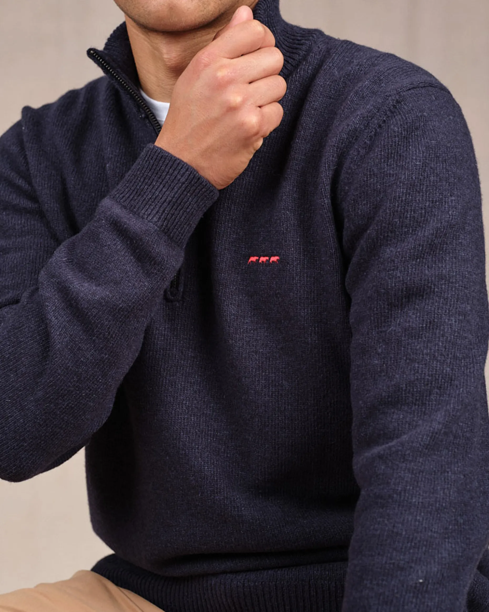 Ce pull à col zippé est un incontournable du vestiaire masculin ! Mélange de laine et de polyamide, il offre confort et chaleur en toutes circonstances. Des finitions côtelées au niveau des poignets, de la basse et du col complètent ce modèle tendance. Décliné dans un coloris bleu marine, il dynamise votre allure et se porte facilement en superposition pour mettre en valeur votre tee-shirt ou votre chemise. Pour des looks décontractés, laissez-vous séduire par ce basique !