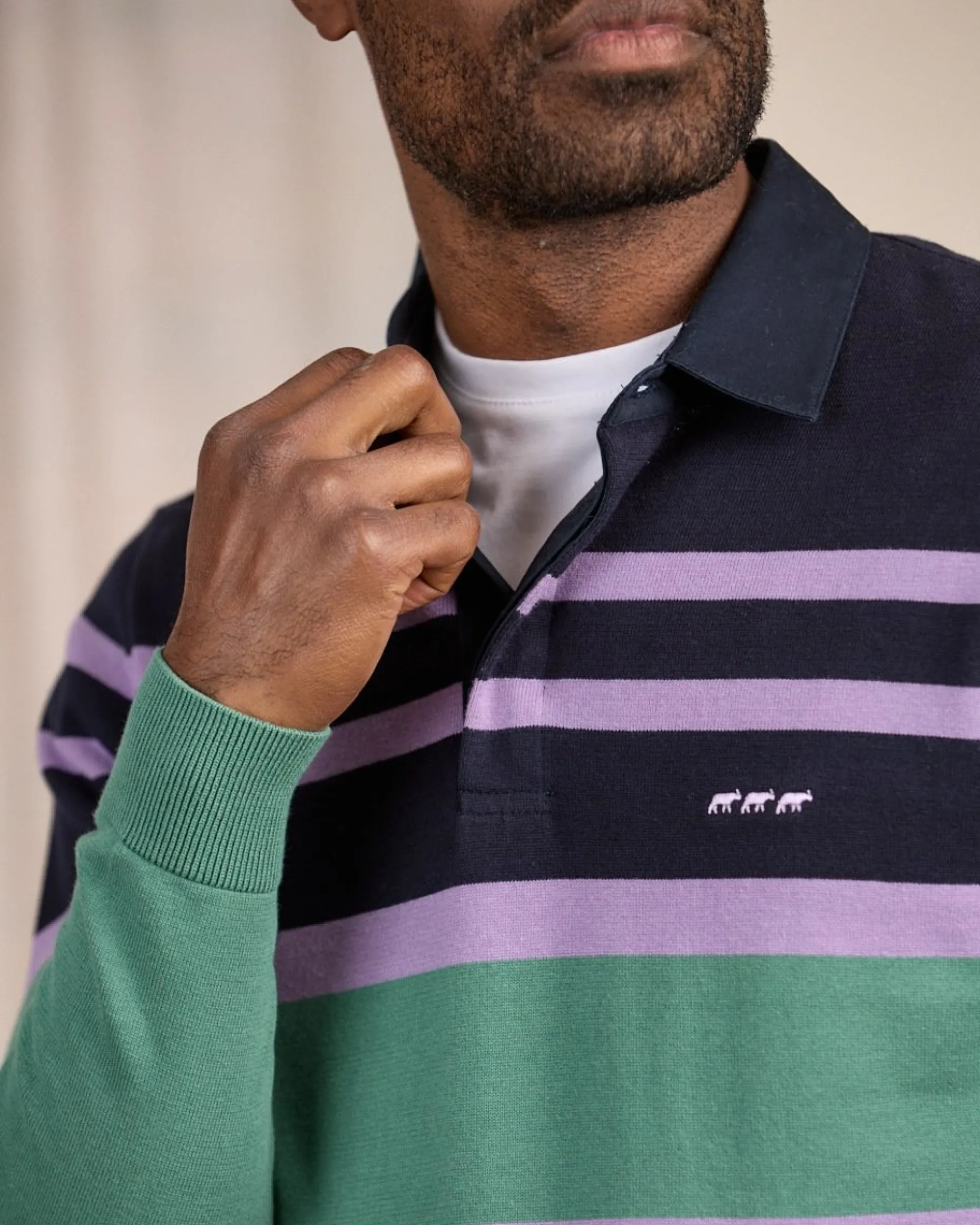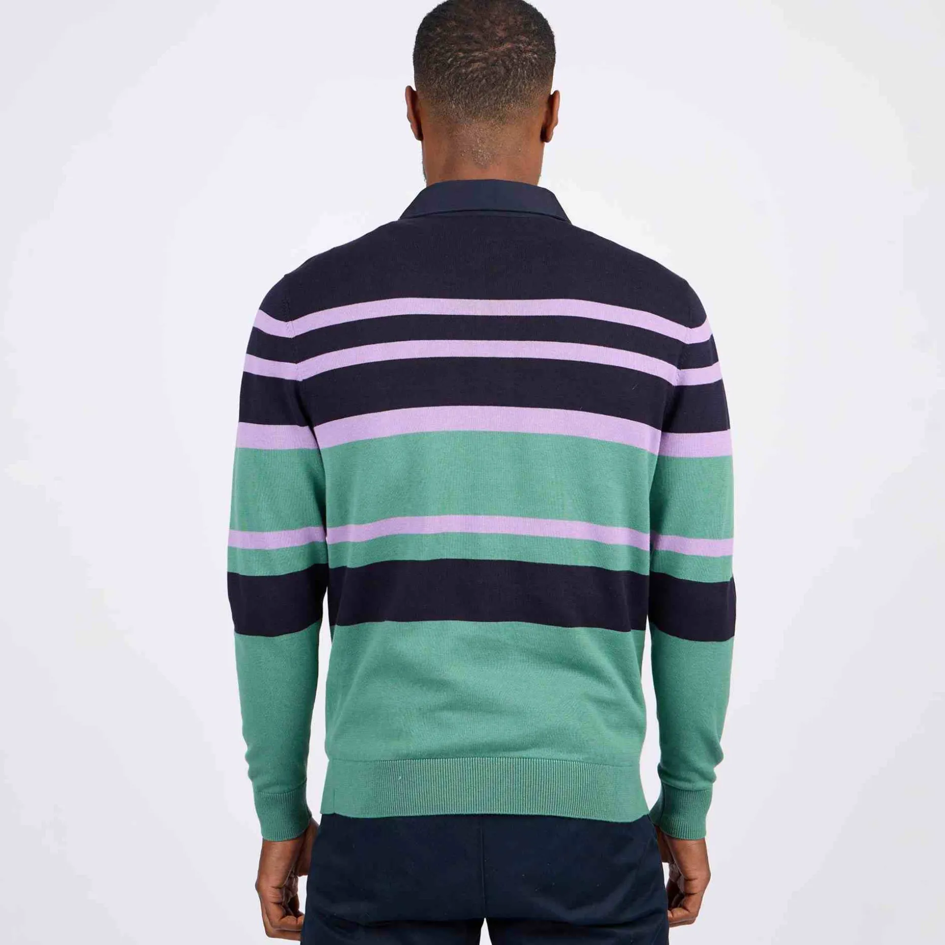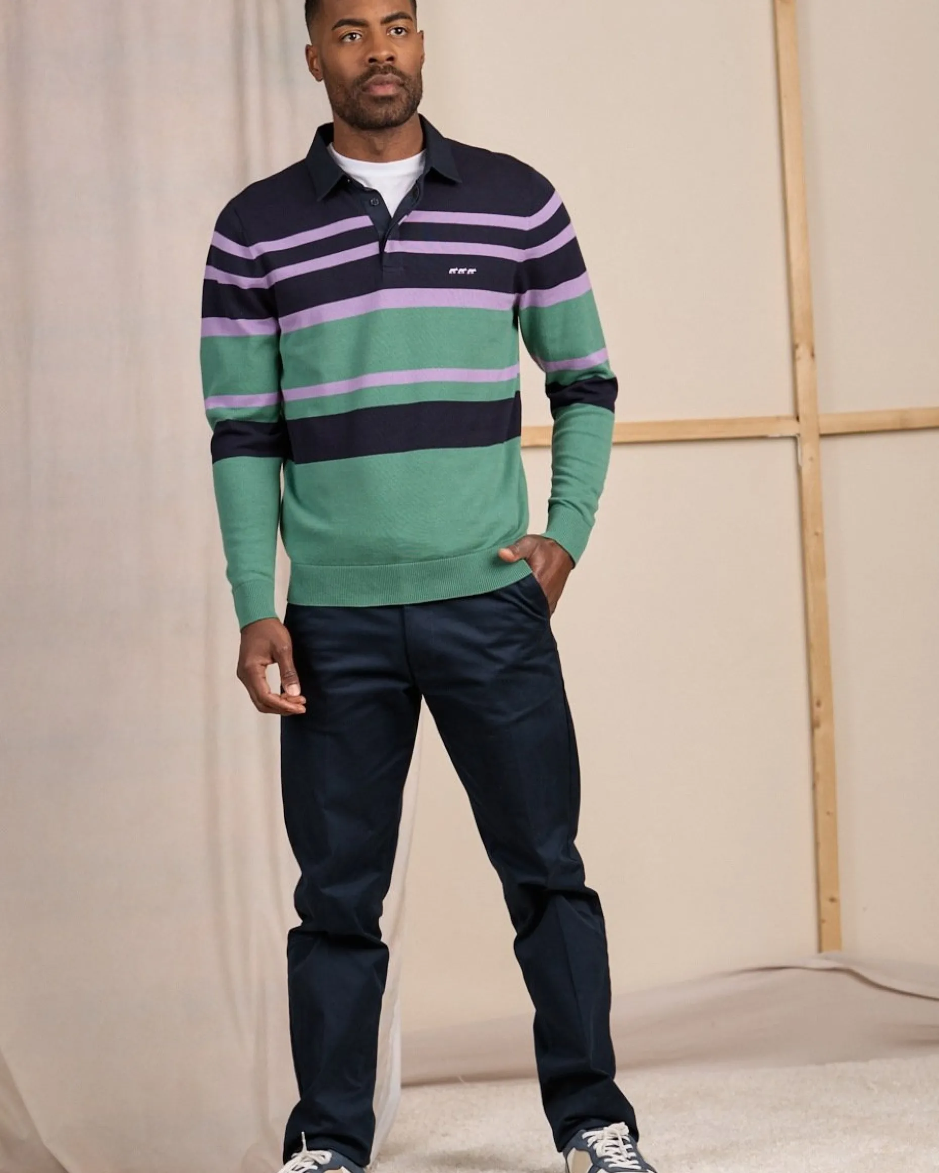 Chic et décontracté, ce pull pour homme à manches longues vous séduira à coup sûr ! Ce modèle bleu marine est doté de rayures et se porte seul ou par-dessus un tee-shirt. Les détails qui font la différence ? Le col polo et les finitions côtelées. Très confortable, il est conçu entièrement en coton. Une broderie « 3 vaches » signe ce modèle tendance et stylé.