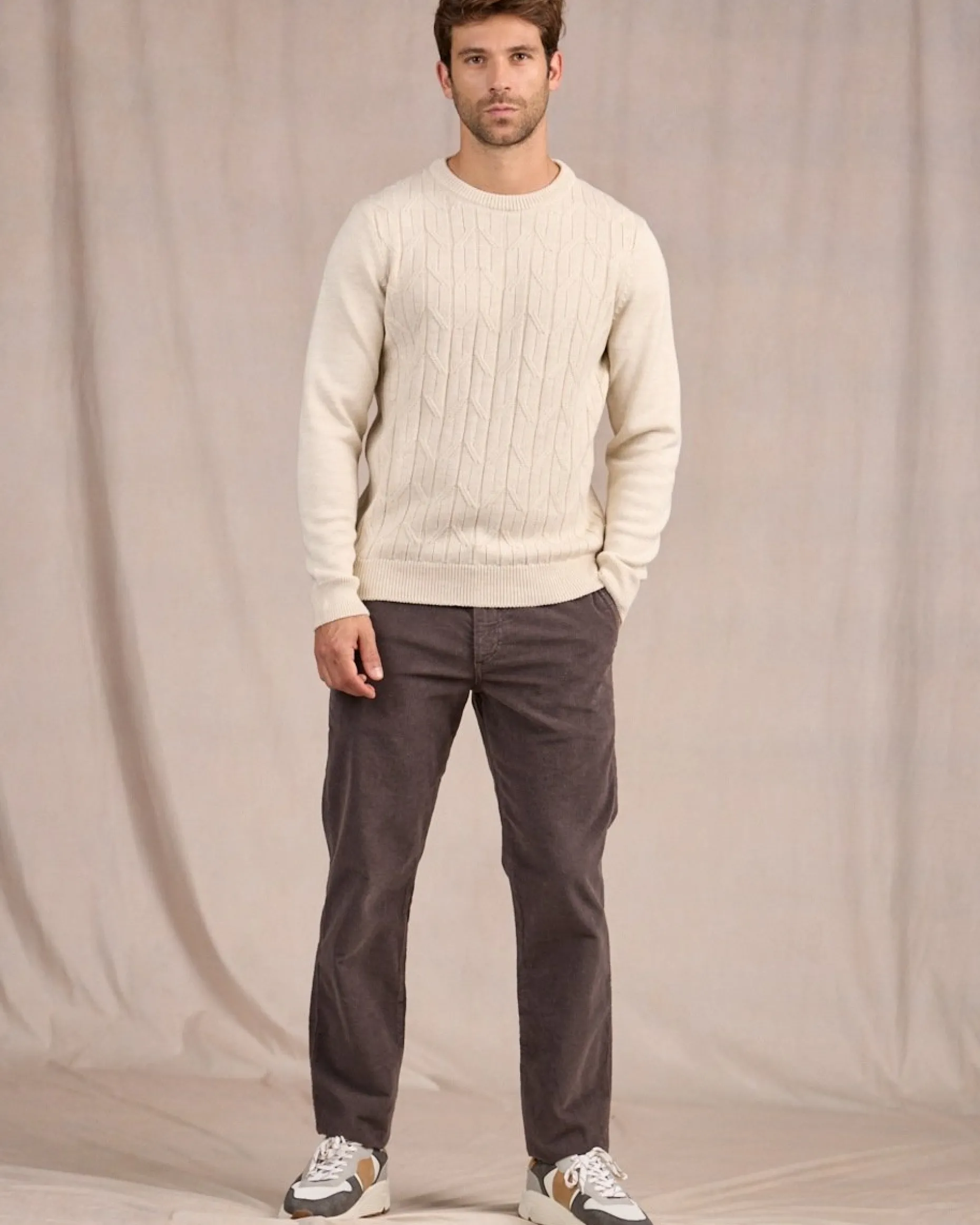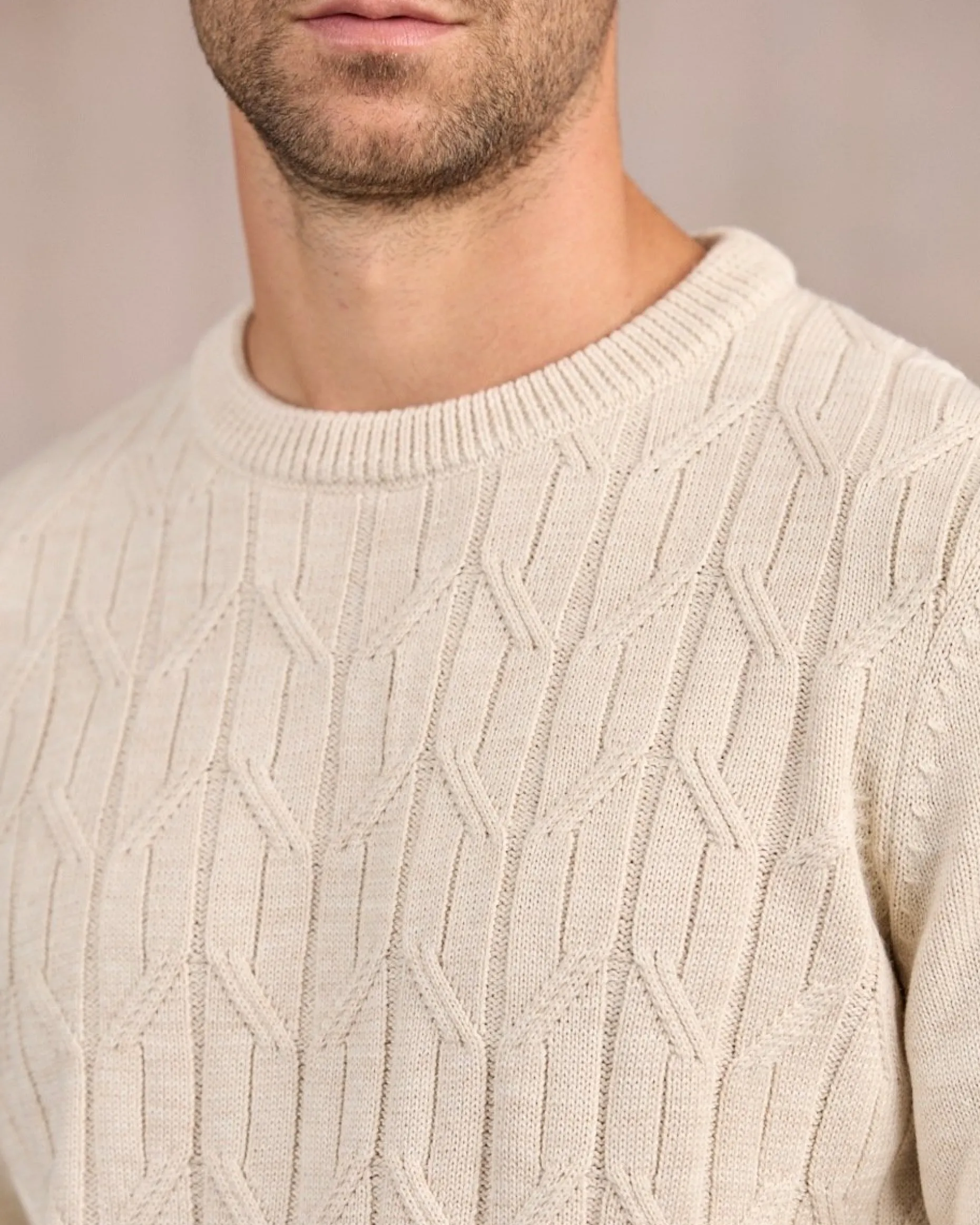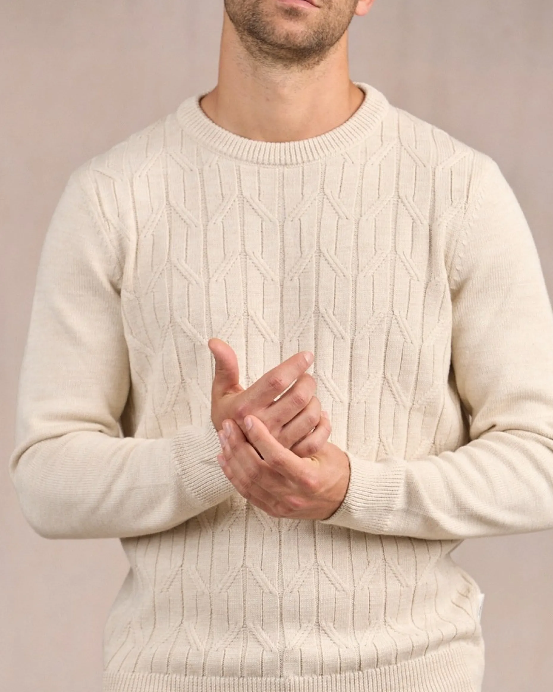 Idéal pour un style soigné, ce pull à col rond est une pièce de choix à posséder dans son vestiaire ! Ce modèle en laine mérinos et acrylique est confortable, robuste et respirant. Réalisé en maille torsadée, il possède une texture prononcée qui fait toute la différence. Des détails côtelés bordent le bas, les poignets et le col. Son coloris beige clair convient aussi bien pour une tenue urbaine chic qu’un look décontracté !