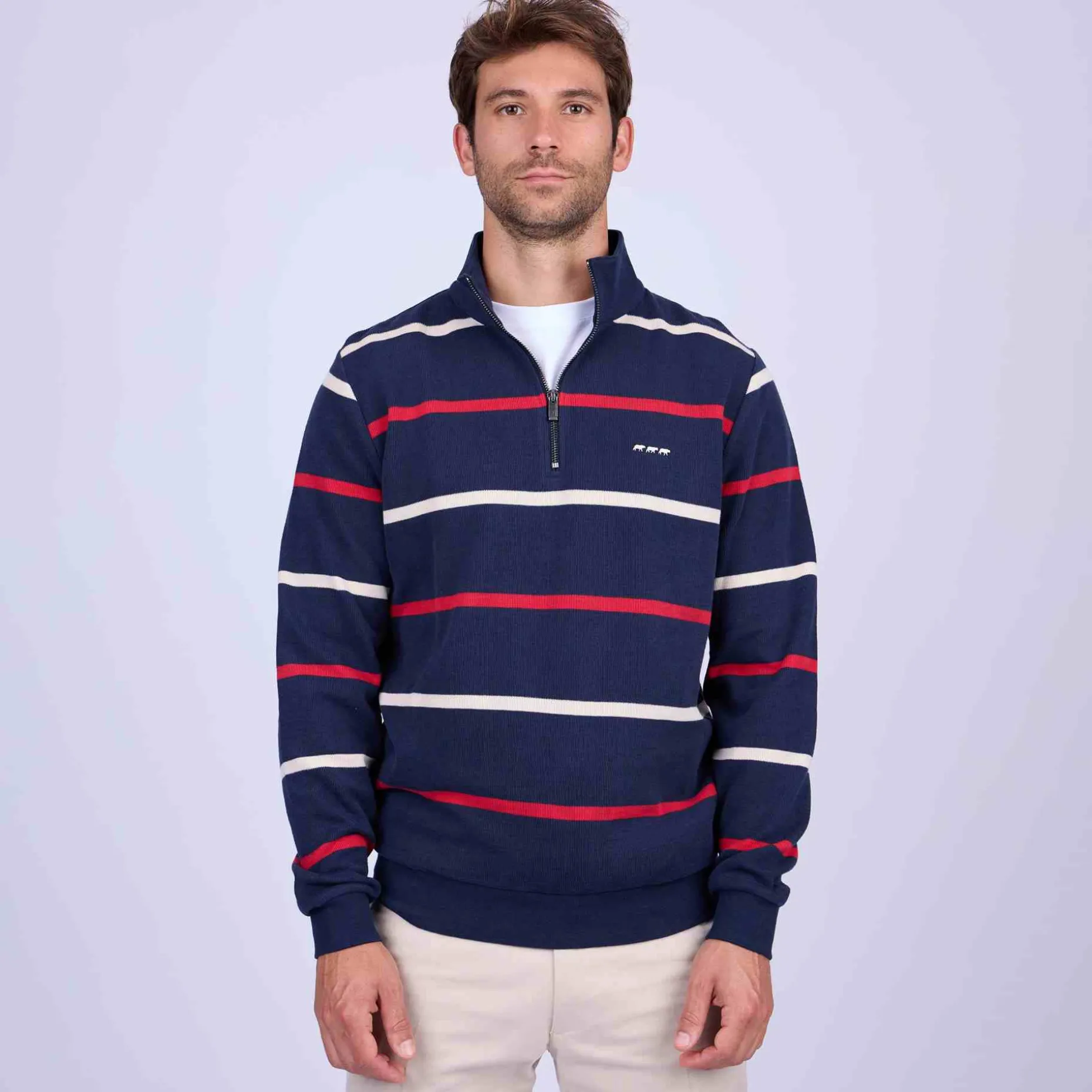 Un style chic et authentique avec ce sweat rayé pour homme ! Ce modèle est équipé d’un col camionneur zippé, d’une coupe droite et des finitions côtelées. Fabriqué à 100 % en coton, il est agréable à porter en toute saison. Avec son coloris bleu marine, il s’associe facilement et se porte aussi bien seul que par-dessus un tee-shirt. Une pièce fétiche pour des looks décontractés réussis !