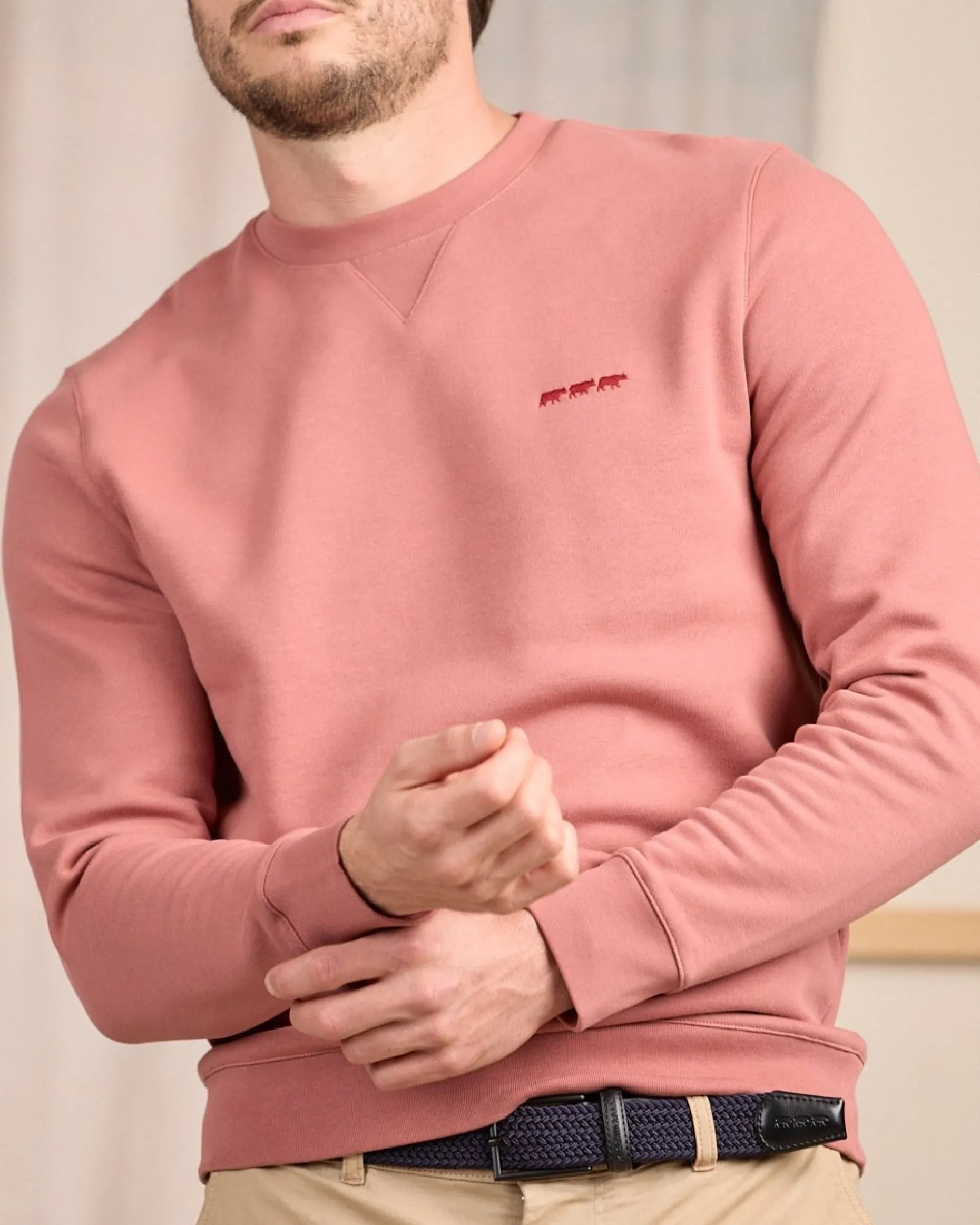 Style, confort et simplicité sont au rendez-vous avec ce pull pour homme à manches longues ! Ce modèle uni au coloris bois de rose se démarque par son col rond et sa couture en triangle sur le devant. Des finitions côtelées et une broderie contrastée « 3 vaches » sur la poitrine parachèvent cet essentiel. Mélange de coton et de polyester, il garantit votre confort tout au long de la journée. Portez-le avec un chino pour un style moderne et élégant !